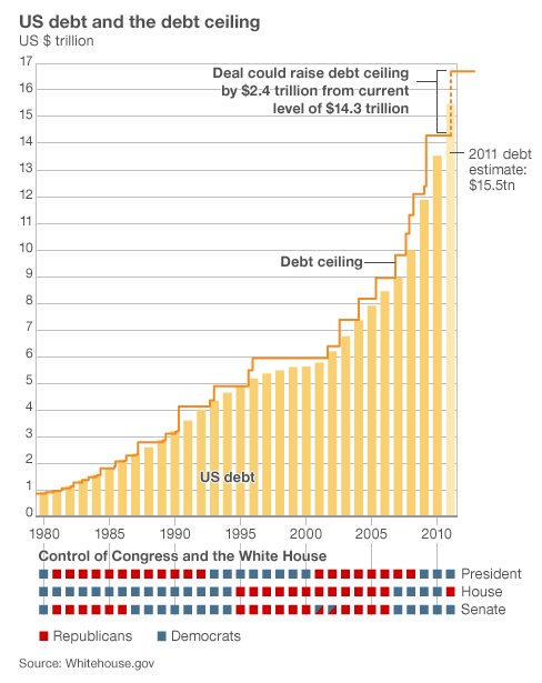 Some of the basic facts: the House and Senate of the USA raised the upper limit for government borrowings up to US$2.4 trillion. But it was only 10 hours before the government would not have been able to pay salaries etc. when the US president was able to sign these regulations into law.