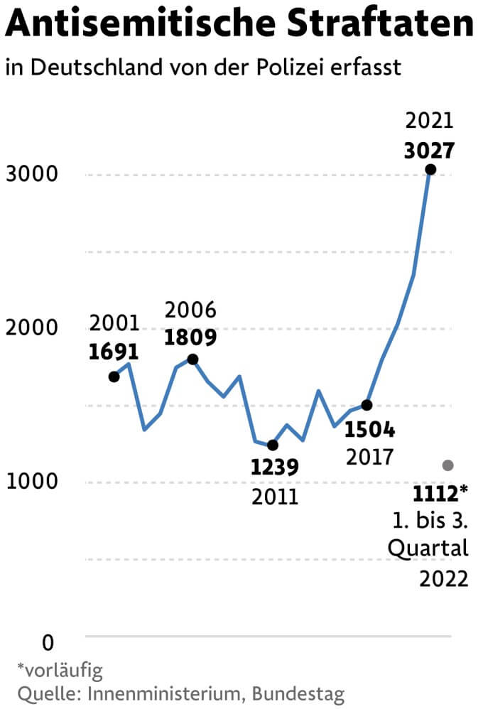 Die Bundesregierung will stärker gegen Hass auf Juden vorgehen und jüdisches Leben in Deutschland fördern. Vor dem Hintergrund stetig steigender antisemitischer Straftaten hat das Bundeskabinett eine „Nationale Strategie gegen Antisemitismus und für jüdisches Leben“ verabschiedet. Ziel der Strategie sei es, das Leben von Juden in all seinen Facetten sichtbar zu machen und Judenhass entgegenzuwirken.” – Im vergangenen Jahr registrierte die Polizei bundesweit 3027 antisemitische Straftaten.