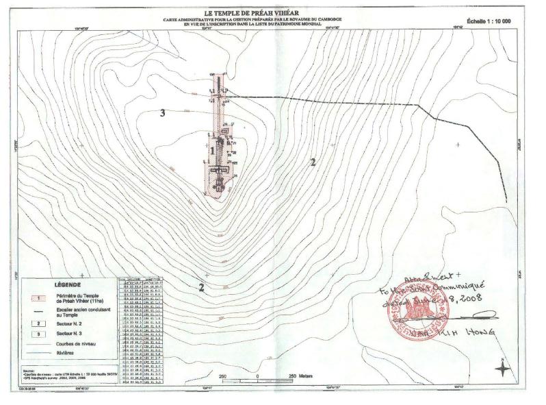 It is also interesting to compare the two maps: The one signed by the Adviser to the Cambodian Government in Charge of State Border Affairs Var Kim Hong, signed on 18 June 2008, and integrated into the UNESCO document of the same day, signed by Deputy Prime Minister Sok An, declaring that “the Kingdom of Cambodia accepts that the Temple of Preah Vihear be nominated for inscription on the World Heritage list without at this stage a buffer zone on the northern and western areas of the Temple.” And the other map, the demilitarized zone ordered by the International Court of Justice 0n 18 July 2011. They are not identical, but similar.